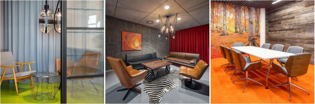 Velké zasedací místnosti jsme však řešili spíše klasicky. Na hlavní pohledovou stěnu jsme umístili velkou celostěnovou obrazovou tapetu, barevně na ni navázali koberec a tím vytvořili silnou konkrétní atmosféru. V menších jednacích místnostech jsme pak šli ještě dál a vytvořili barevně a materiálově divadelnější kompozice. Ty jsme navíc doplnili výstředním nábytkem a velkými skleněnými svítidly zavěšenými do kožených popruhů. Ocitnete se tak v prostředí, které s vámi trochu zamává a vytrhne vás z každodenní rutiny.